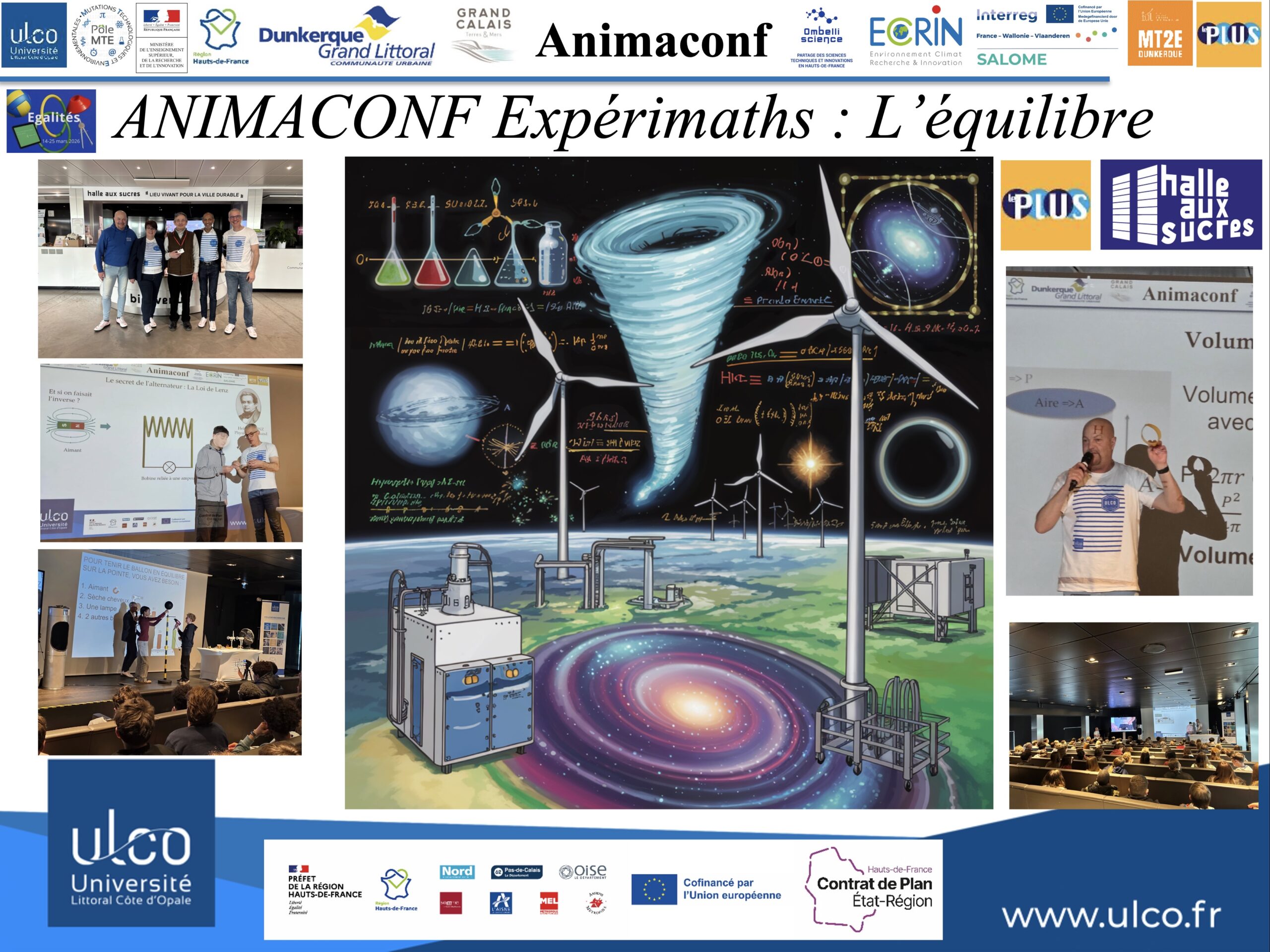 Dans le cadre de la 15ᵉ édition de la Semaine des mathématiques, le Palais de l’Univers et des Sciences de la Communauté Urbaine de Dunkerque (CUD) a organisé, en partenariat avec la Halle aux Sucres et le Pôle de Recherche Mutations Technologiques et Environnementales (MTE) de l’Université du Littoral Côte d’Opale (ULCO), une Animaconf itinérante consacrée au thème de l’équilibre.